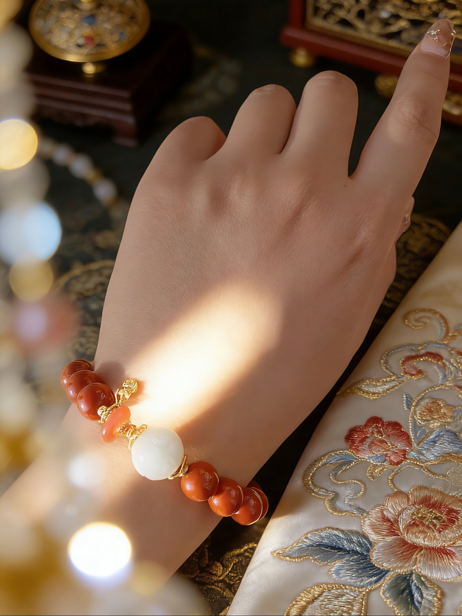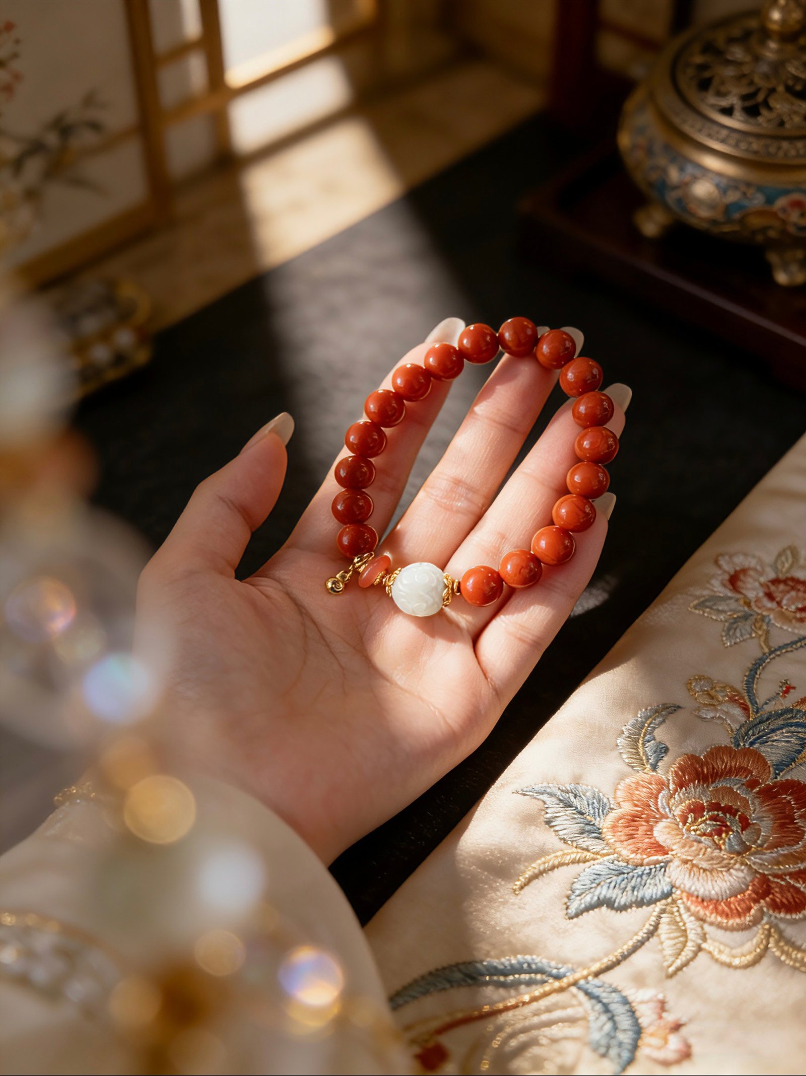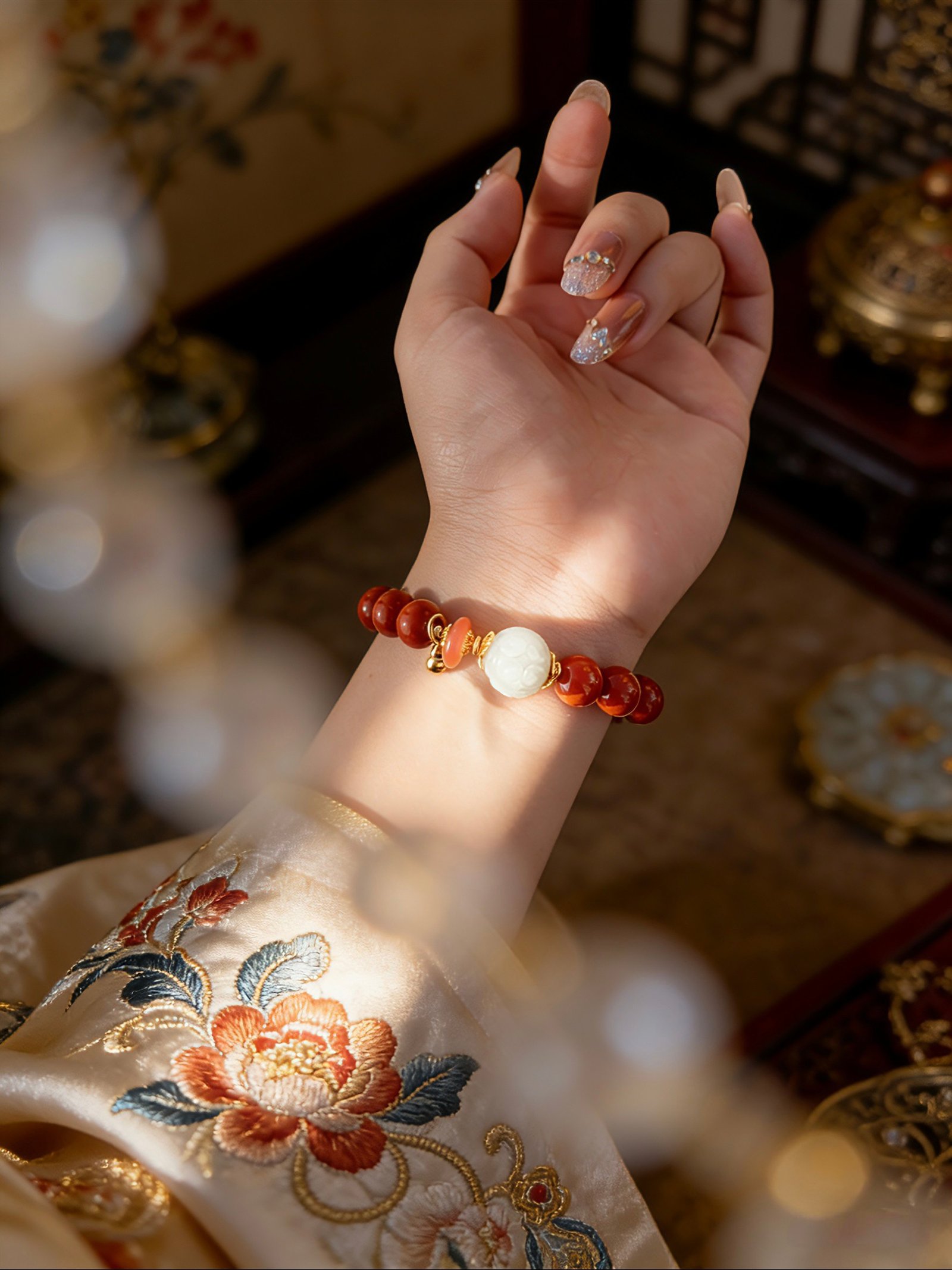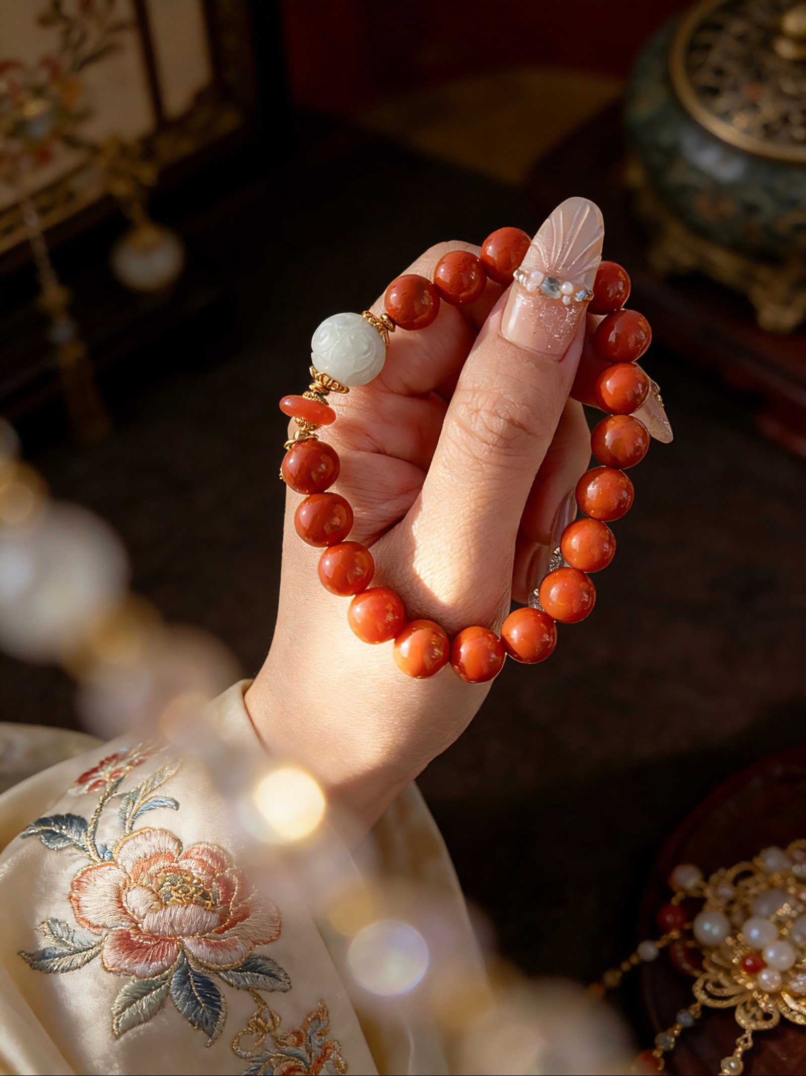 Fiery Red Agate to lock in fortune, paired with a breath of Pale Celadon Jade to purify your energy field. The subtle green glow of the jade meets the warmth of the agate, weaving a protective shield of peace and safety around your wrist.
