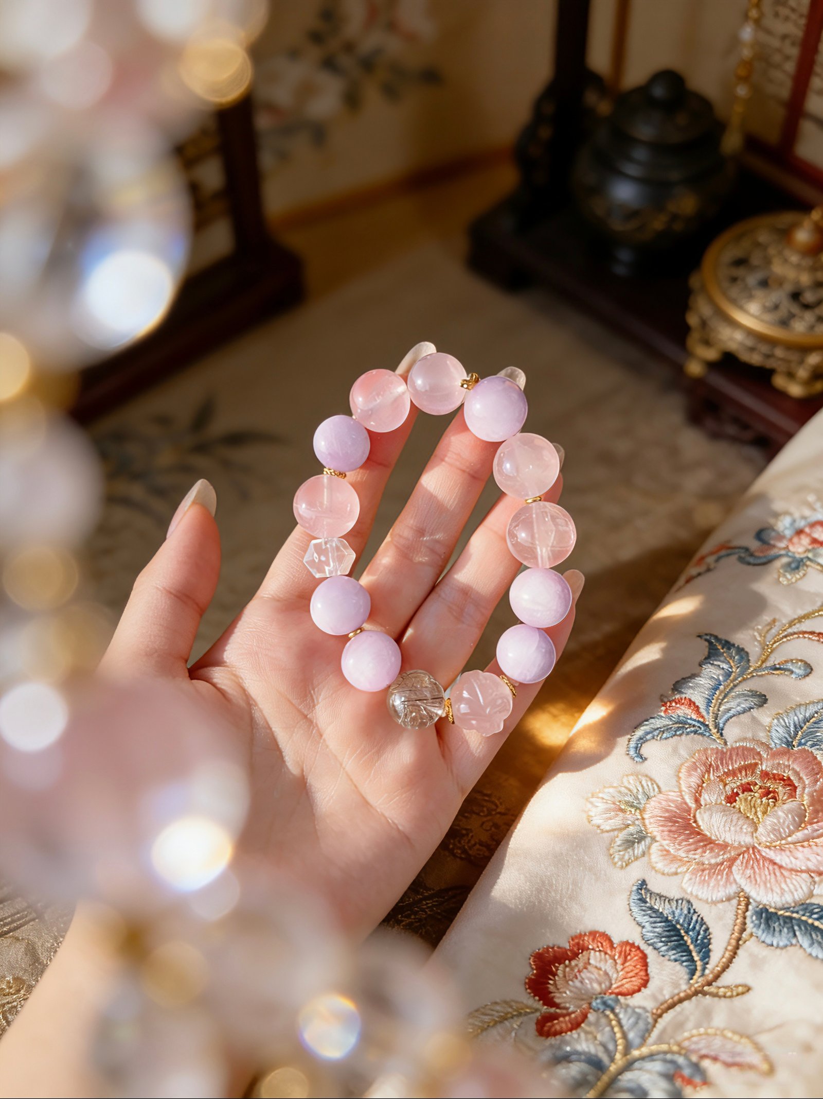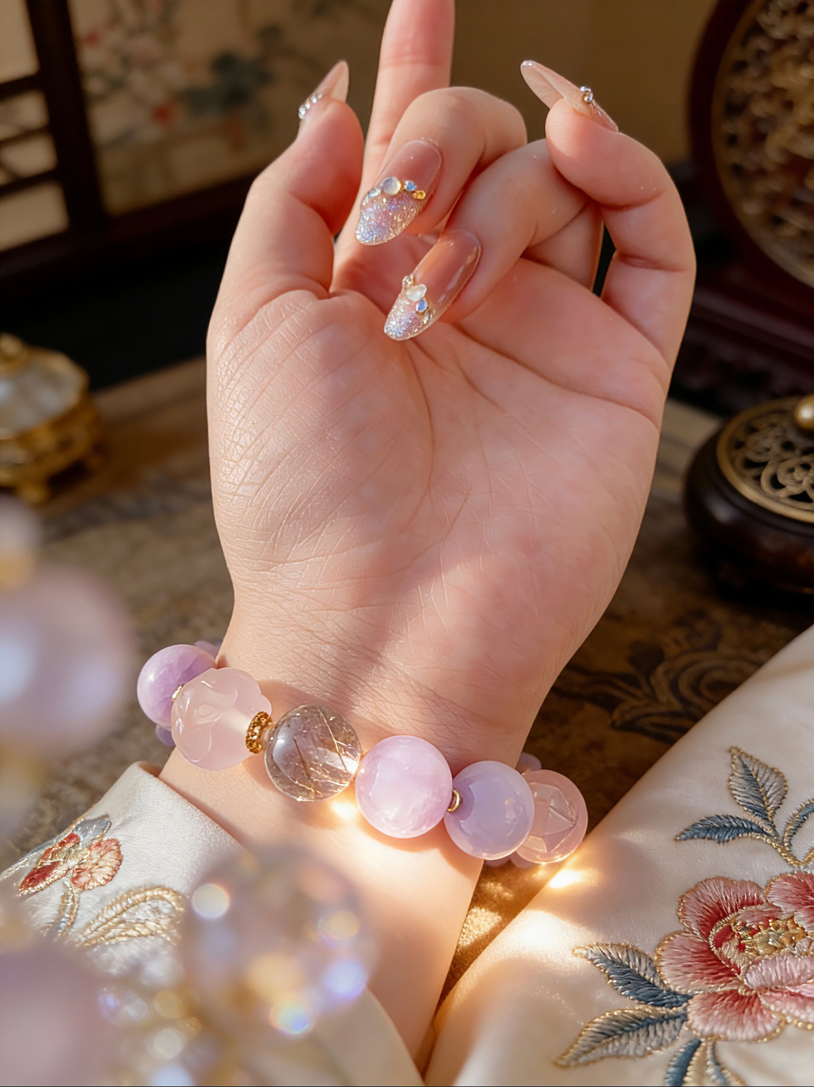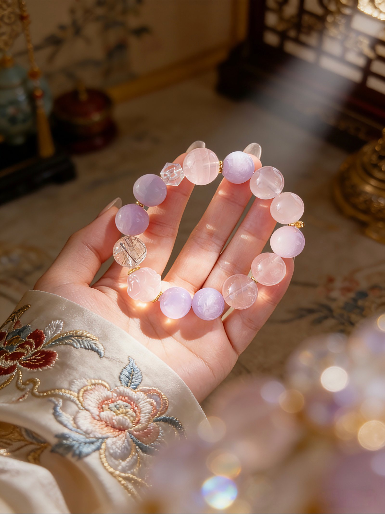 * Aesthetic: Dreamy pastel palette with intricate flower-carved beads and geometric crystal accents.