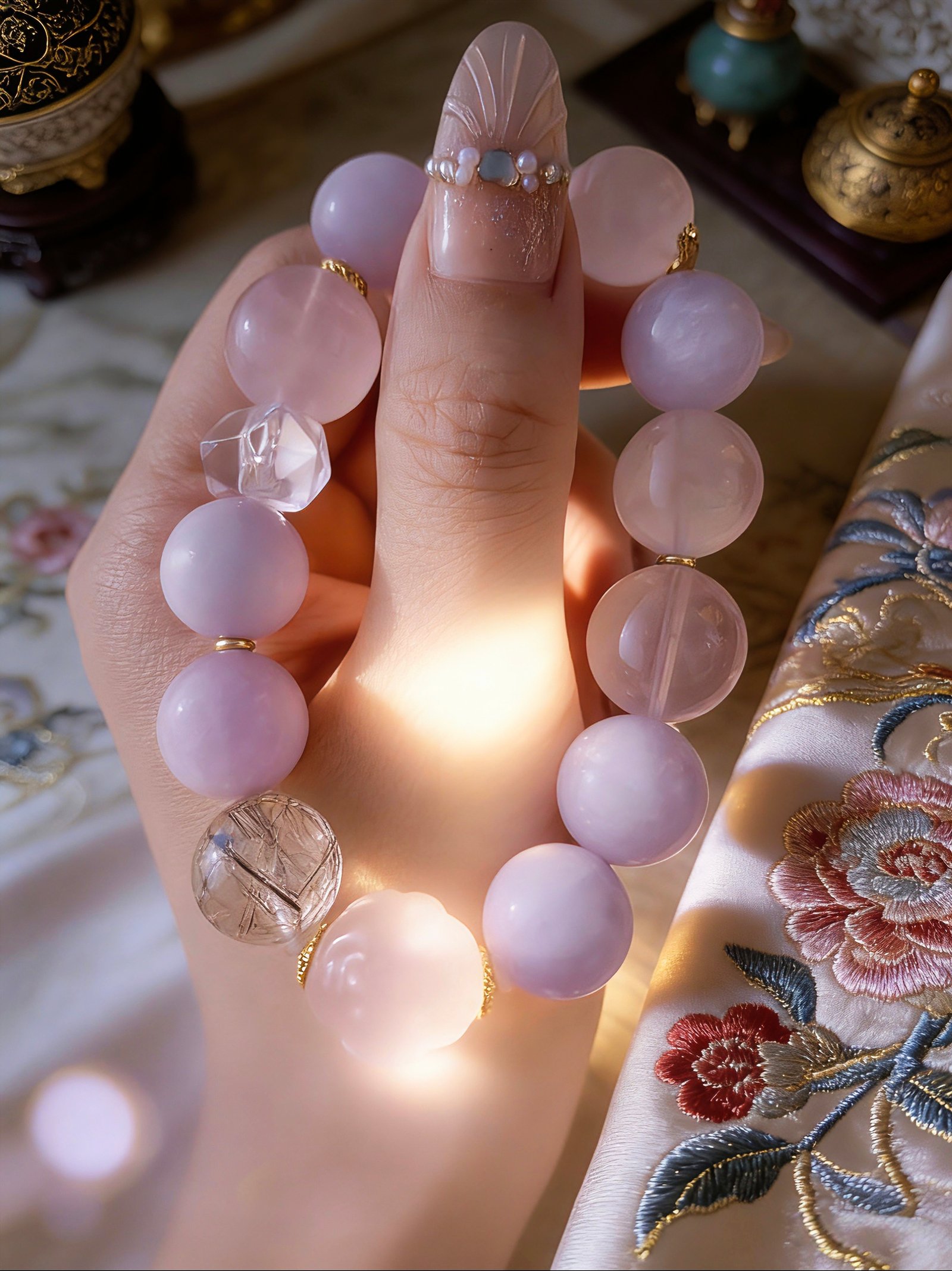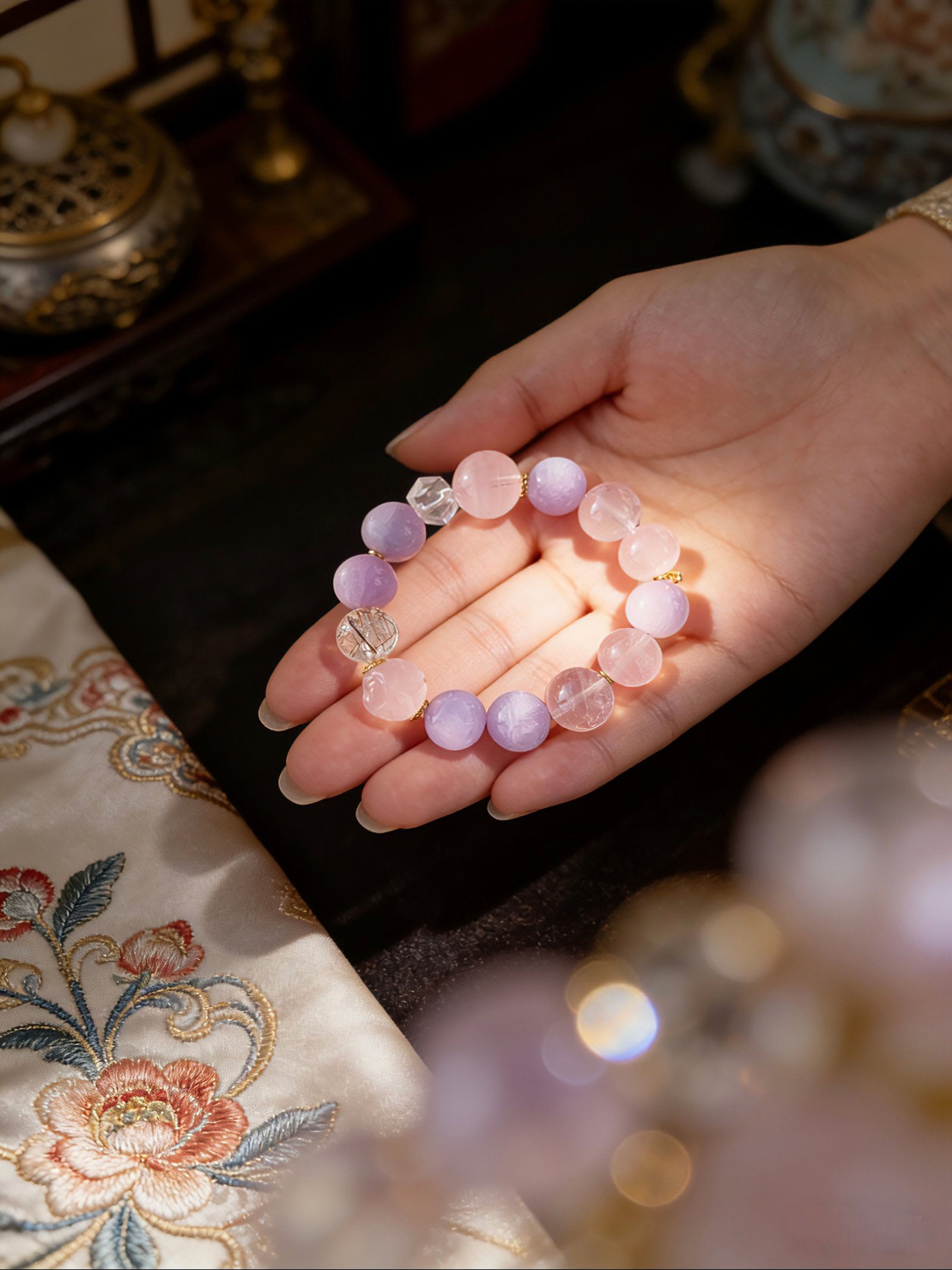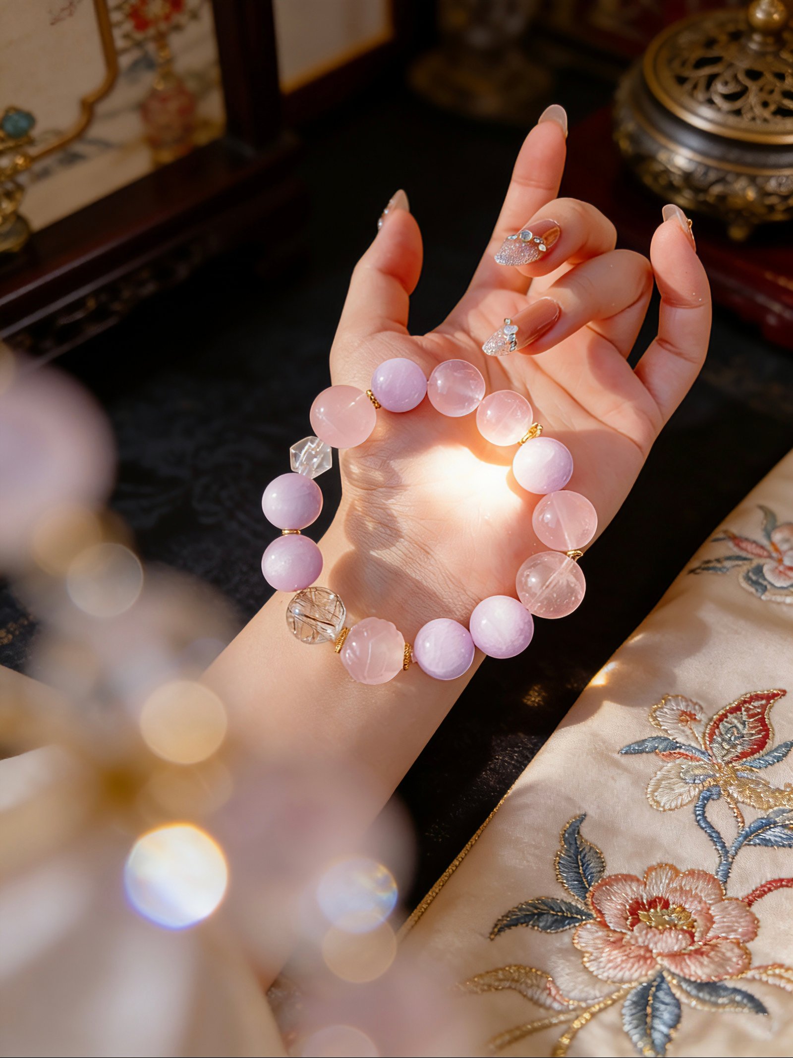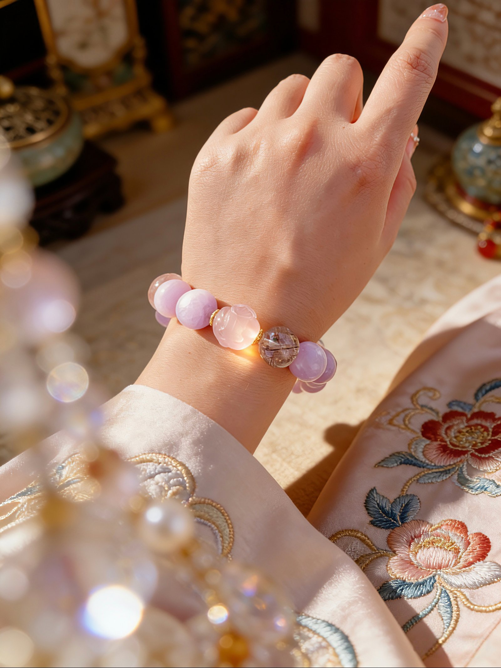 * Aesthetic: Dreamy pastel palette with intricate flower-carved beads and geometric crystal accents.